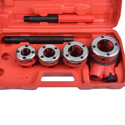 Комплект состоит из четырех клуппов, каждый из которых предназначен для определенного диаметра трубы, что делает его универсальным решением для различных задач. Плашкодержатель с трещоточным механизмом облегчает процесс резьбонарезки, позволяя работать быстрее и с меньшими усилиями. Использование трещотки значительно ускоряет выполнение работы, делая процесс плавным и удобным.